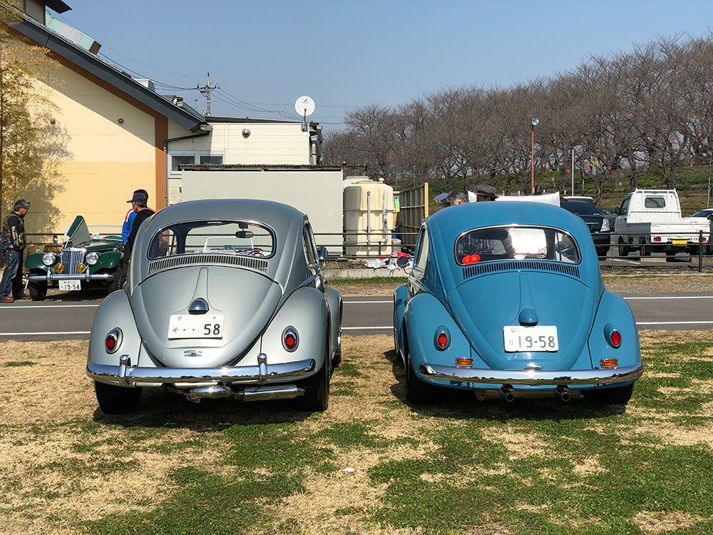 終了時間が近くなって来た頃、瑞穂のイベントで心を鷲掴みにされた青カブトと同じ58年のオーナーさんに「並べて写真撮りませんか?」とお誘いいただく。
